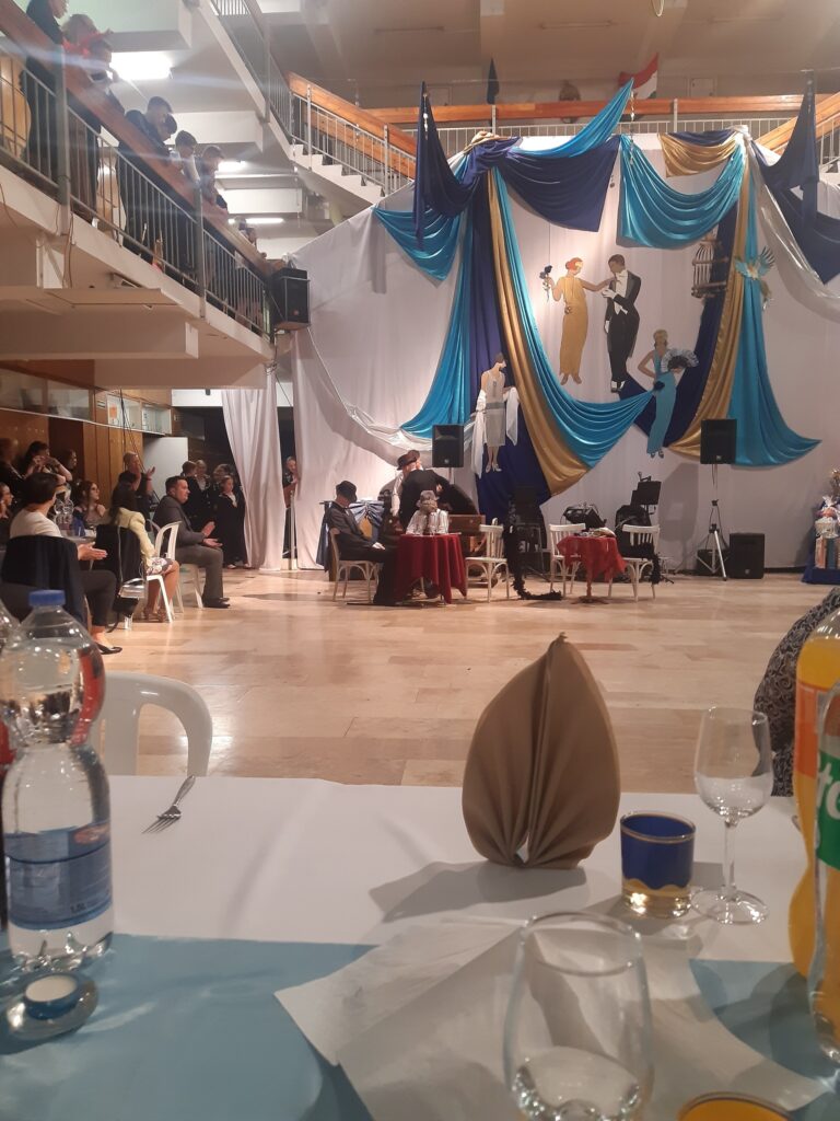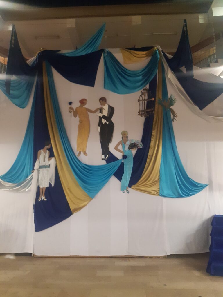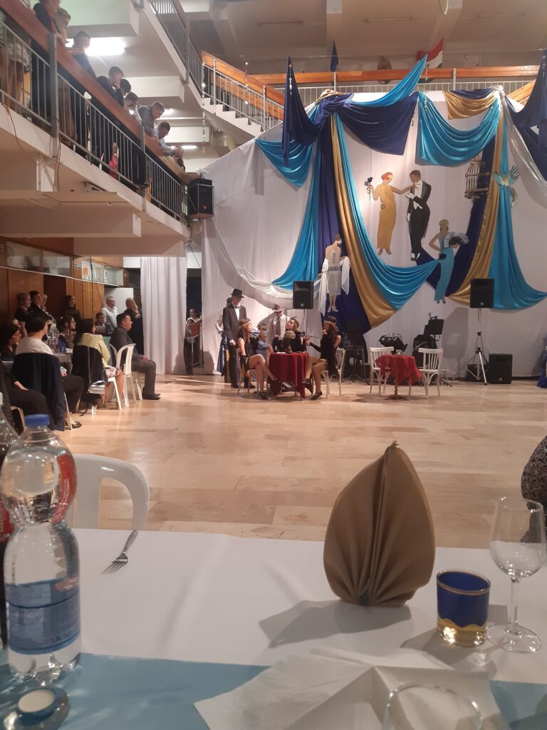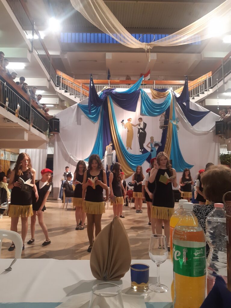 Az idei jótékonysági bálunk mottója: „A múlt örökre elmúlt, a múlt mindig él.” Az idézet Scott Fitzgerald amerikai író 1925-ben megjelent A nagy Gatsby című regényéből származik. Mind a díszlet, mind a műsor ebben a stílusban készült.
